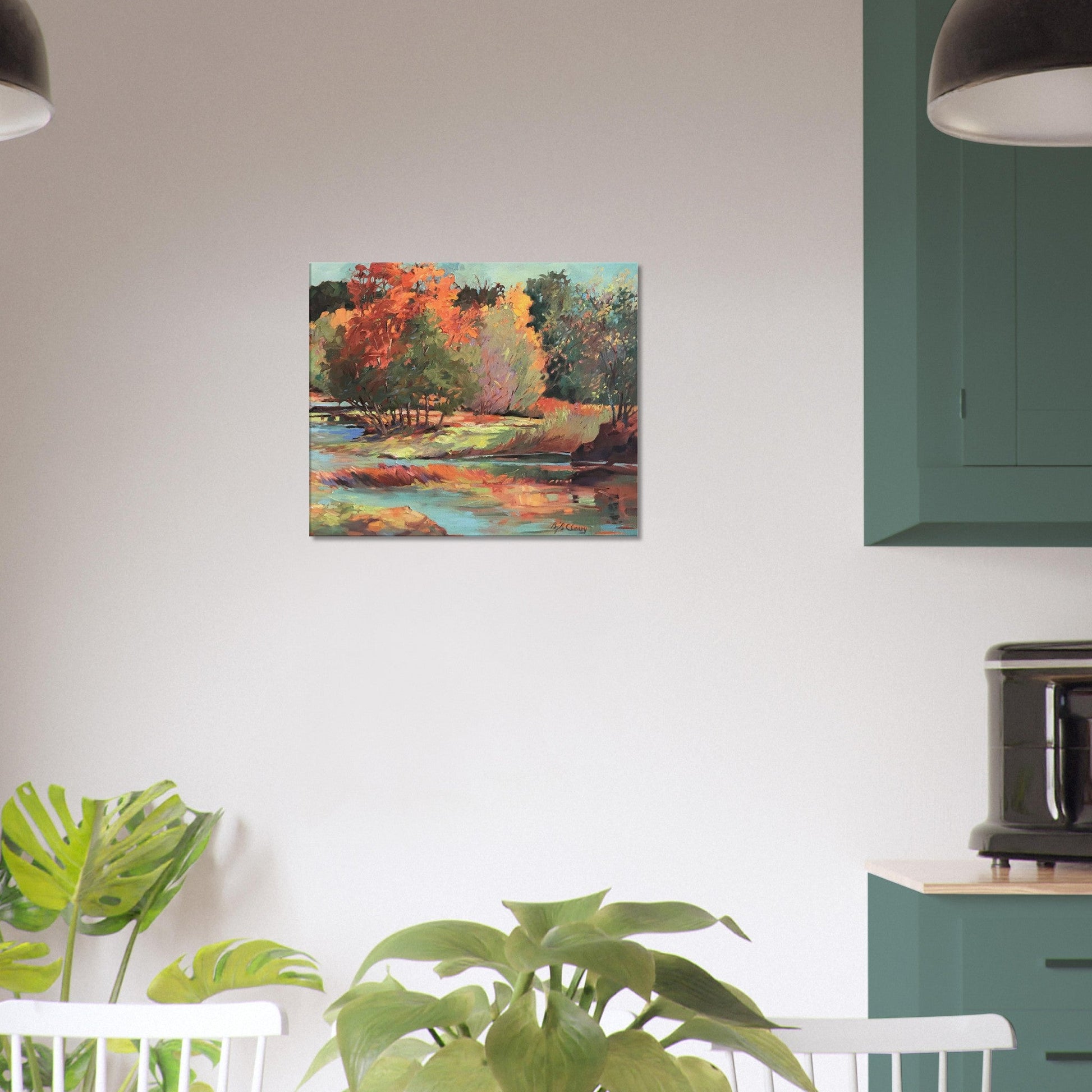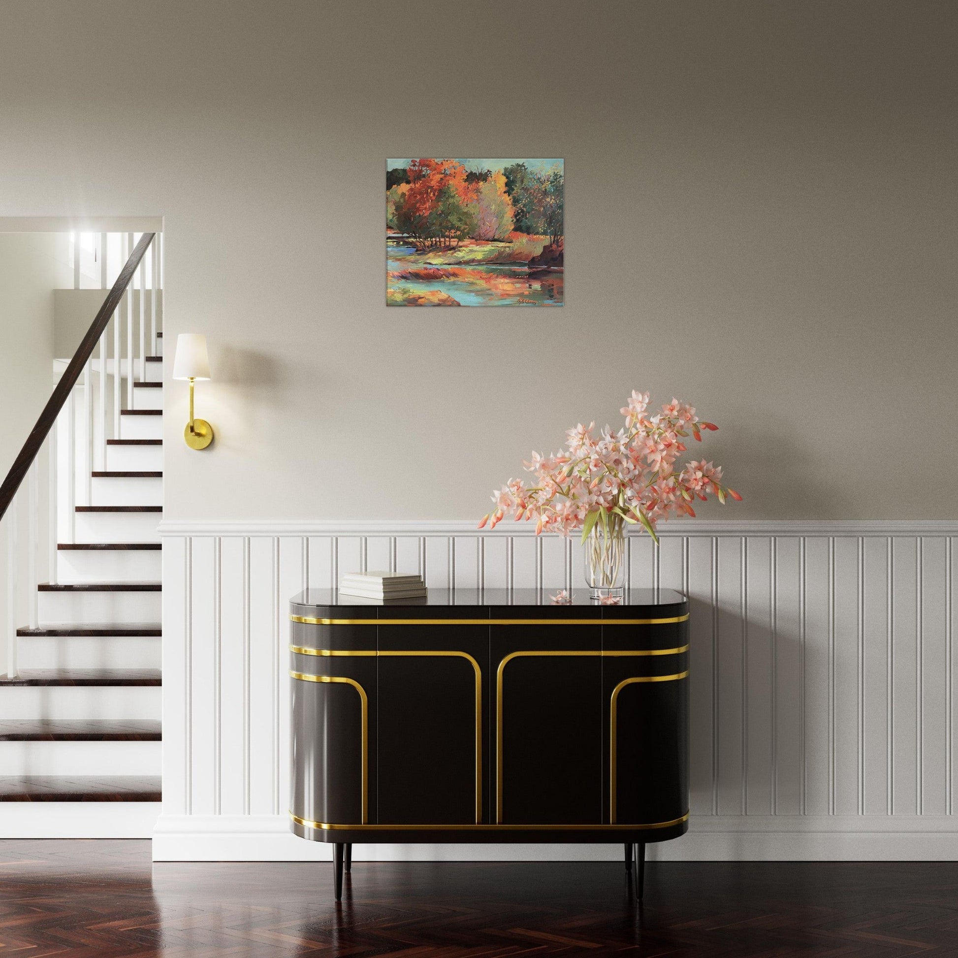 Barbara Cleary’s “Along the Illinois” is a masterful forest painting that embodies the elegance of country home decor. The intricate brushwork, natural hues, and vivid depiction of a pine tree painting create a harmonious blend of serenity and rustic charm. Perfect for farmhouse decor or as an accent in a living room décor setting, this piece bridges the gap between timeless artistry and modern sensibilities.
