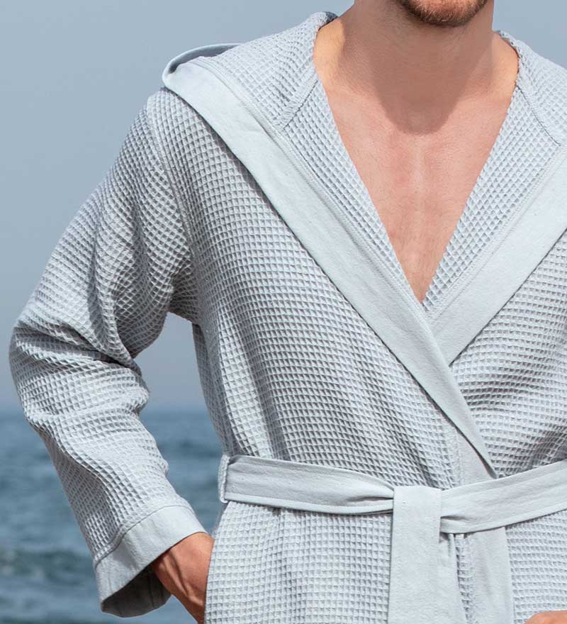 Luxuriously comfortable Turkish cotton with hood to help keep ease of mind all day long. Relax in this soft waffle knit robe for men with a refreshing and clean aesthetic.