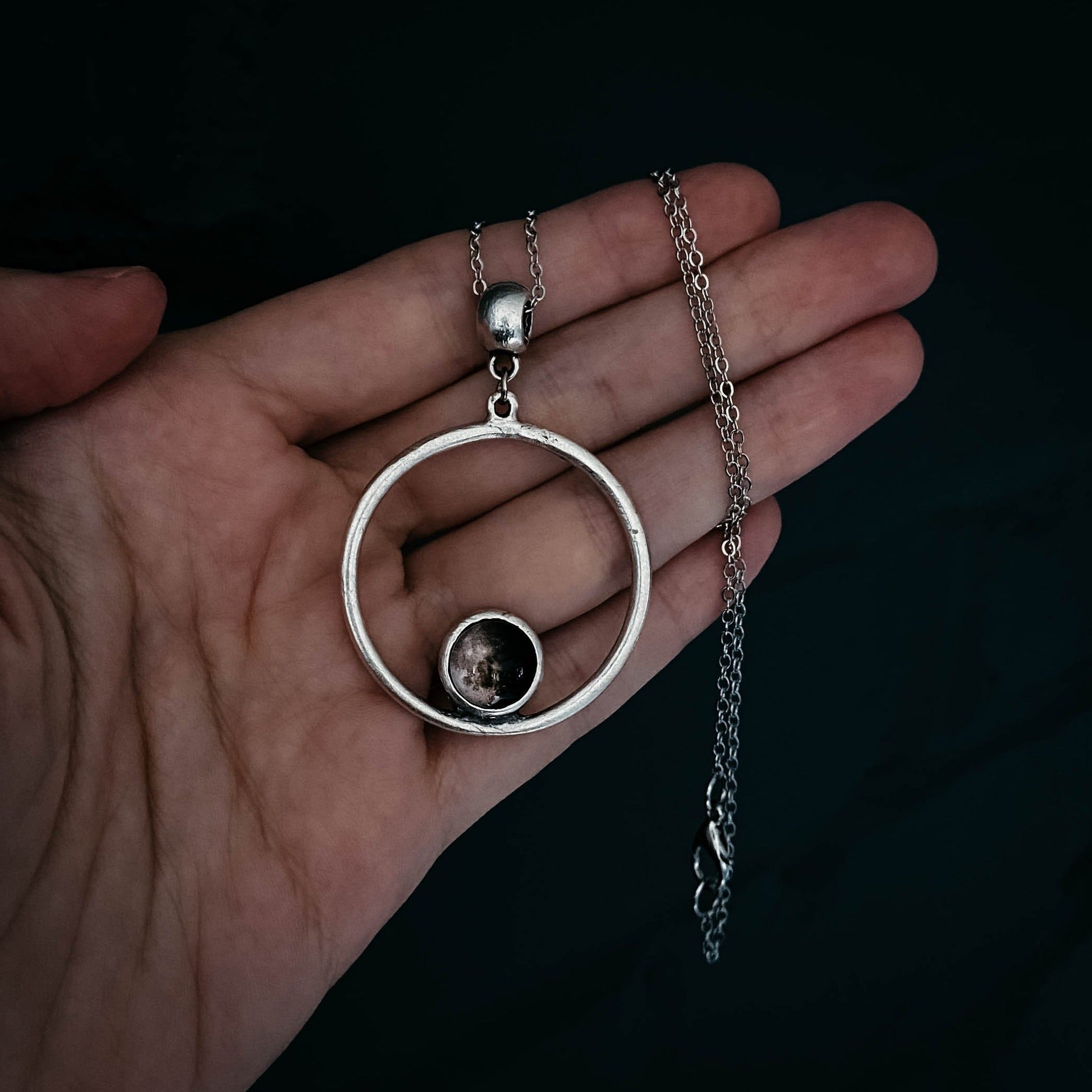 This simple round circle necklace is nestled with something very special - the phase of our Moon from a special moment. What Moon phase was shining on your birthday? Wedding? The day you lost a loved one? What about a special piece as a gift for someone else that commemorates their favorite memory? We help you find out how the Moon appeared in the sky during that moment and create this timeless keepsake with it. Simple enough for everyday wear, but striking enough for special occasions, this round pendant with your personal touch will be a staple in any jewelry rotation and makes a fabulous gift.