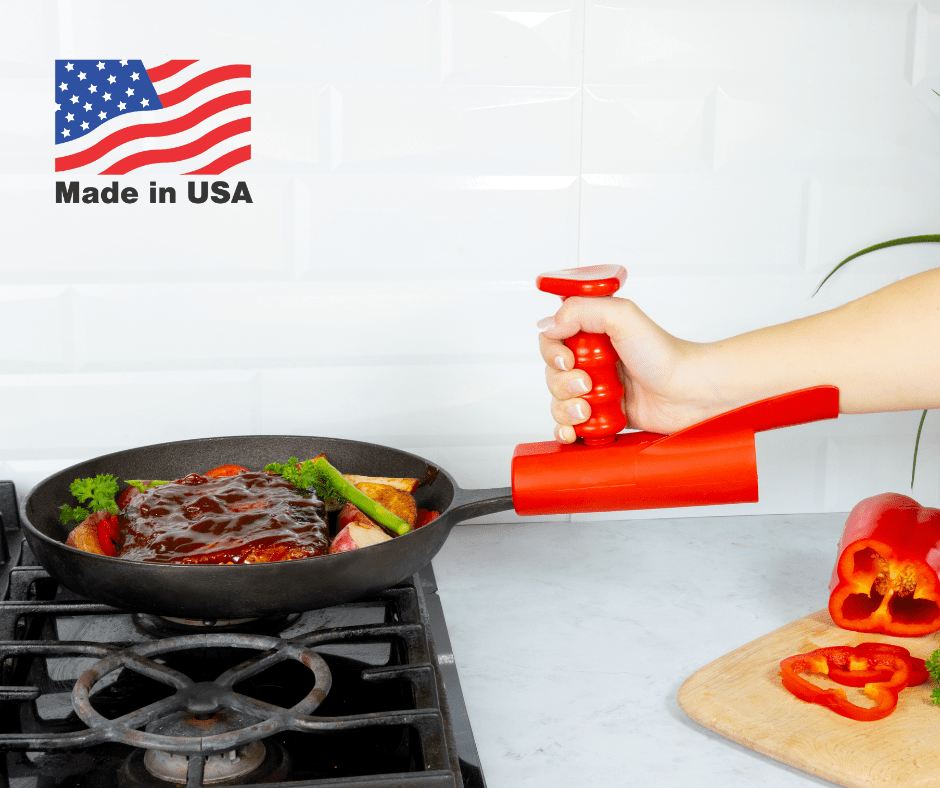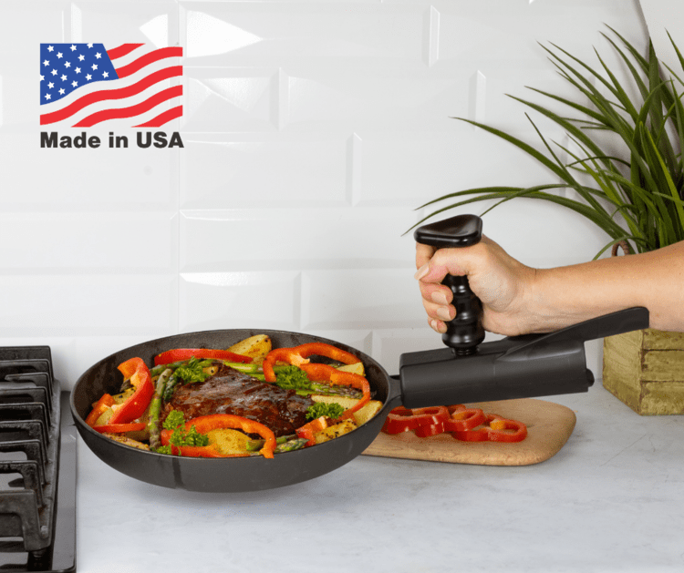 • The Pan Buddy™ comes in two pieces, a vertical handle, and wrist support.