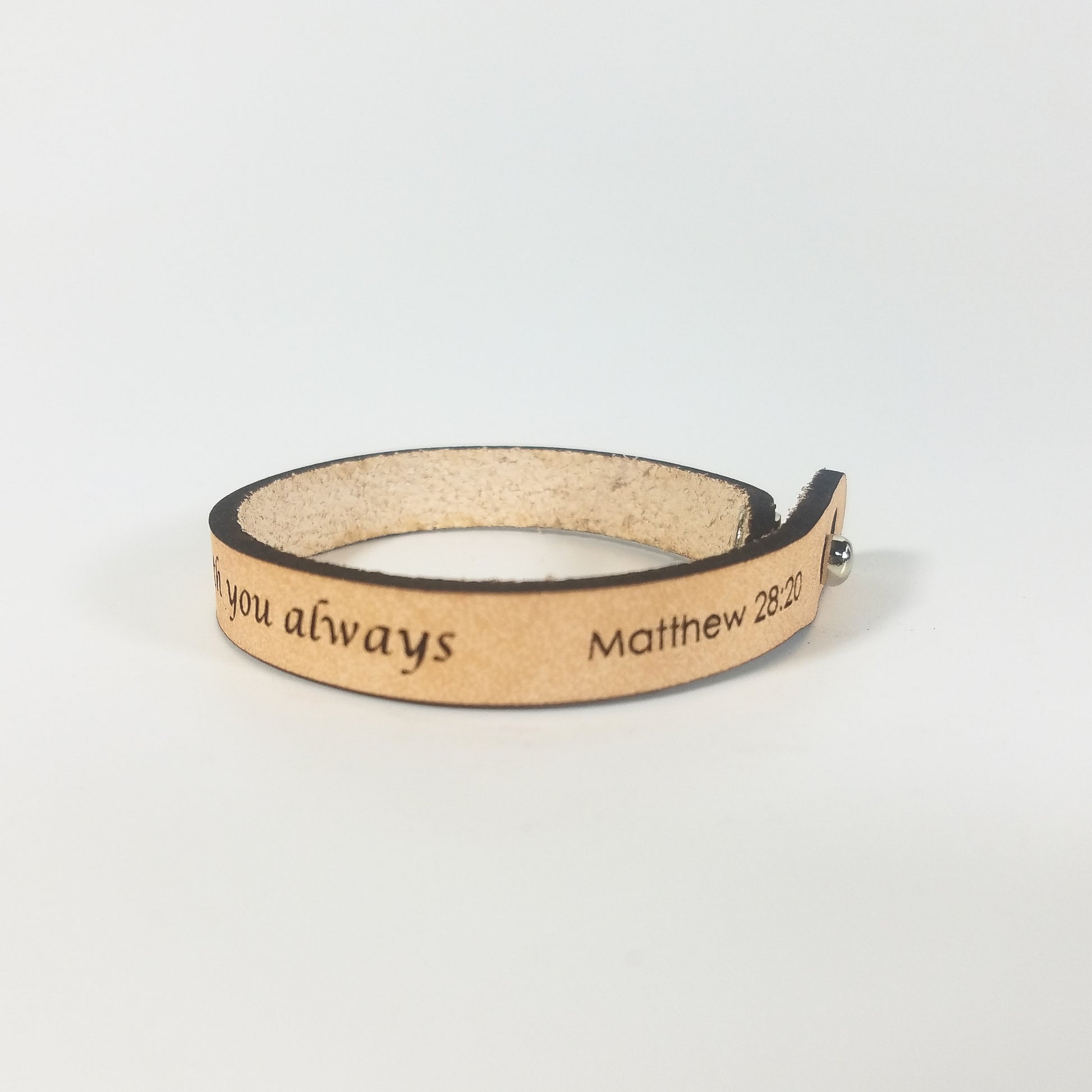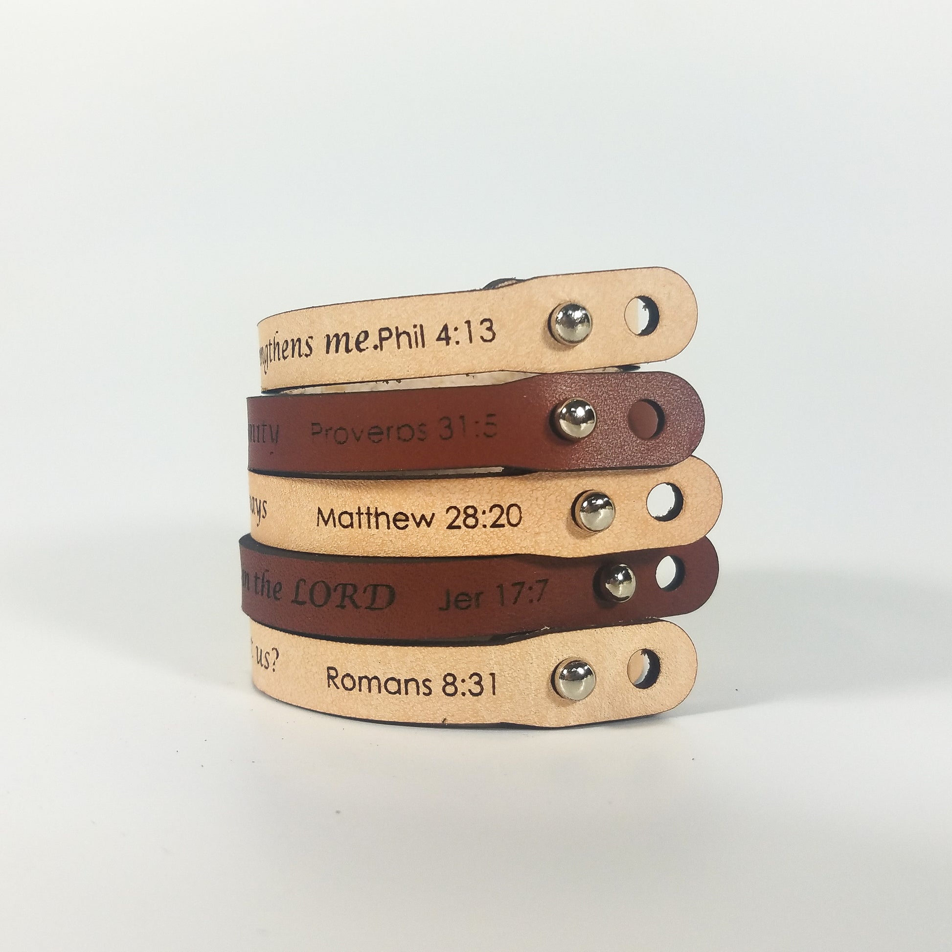 Our spiritual quote bracelets are laser etched on vege-tanned genuine leather. Bracelets include the chapter reference (reference may be abbreviated).